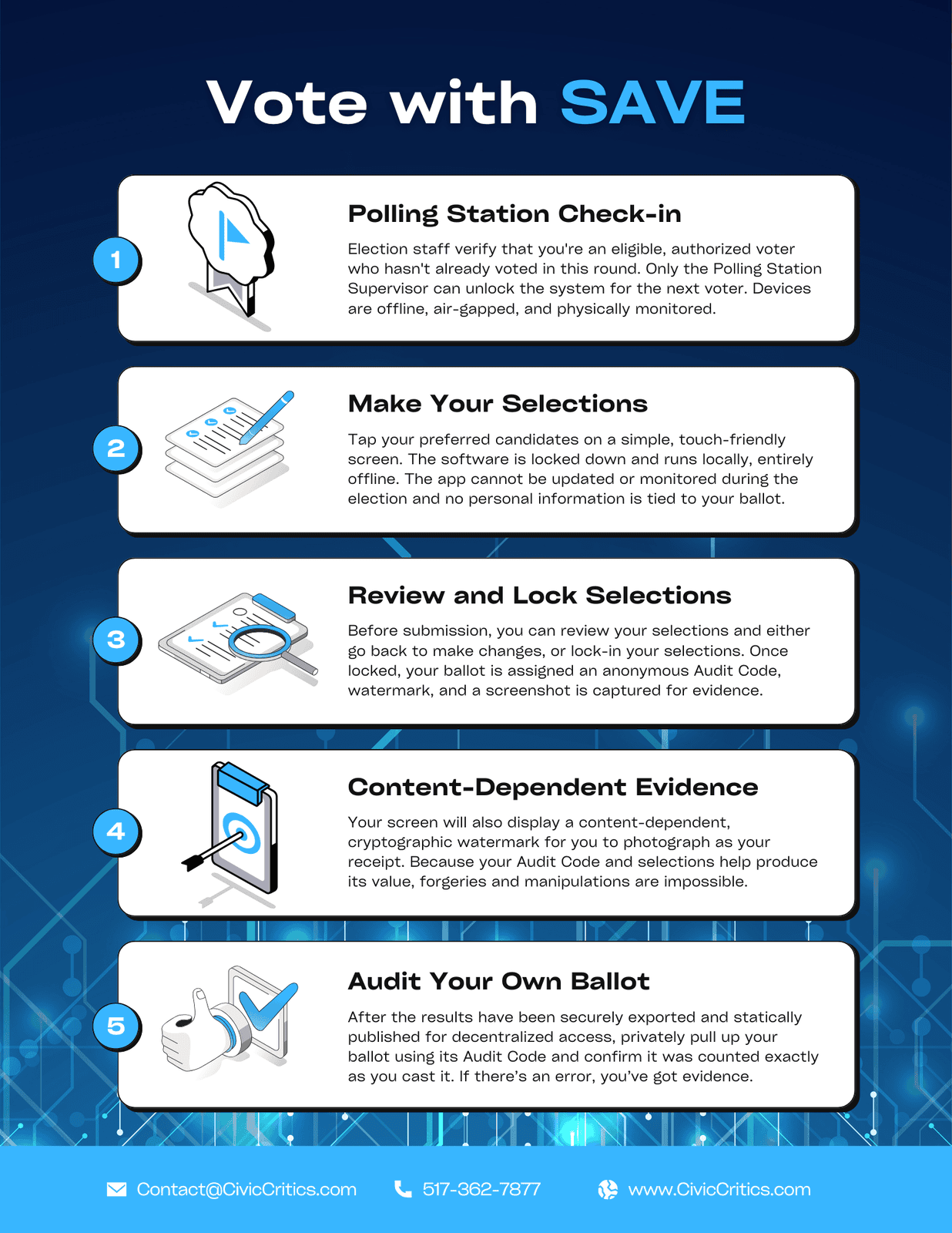Self Auditable Voting with Evidence [SAVE] is revolutionizing elections by eliminating the need for trust, and replacing it with voter verification!
